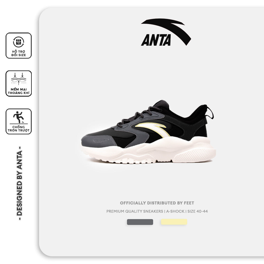 - Đồng hành cùng thiết kế thời trang, giày thể thao Anta mang tính năng thoáng khí, giúp cân bằng nhiệt và độ ẩm trong những điều kiện môi trường khác nhau, đế có các đường rãnh chống trơn trượt.